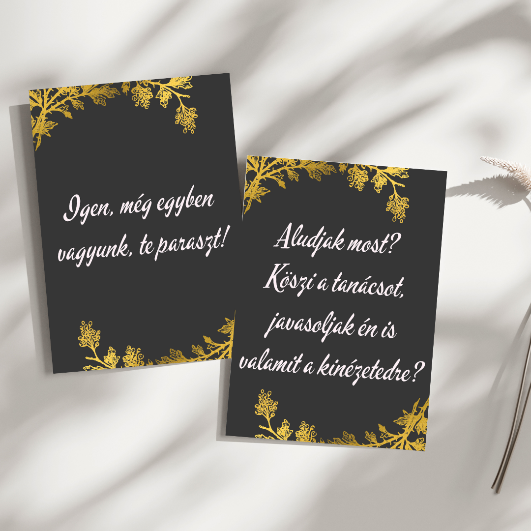 A Szarkasztikus Kismama Kártyák pontosan erre készültek: ütős, humoros, és fájóan igaz válaszokat adnak a kéretlen megjegyzésekre.